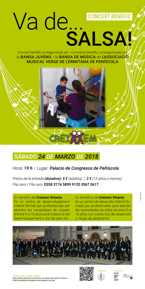 La Asociación Musical Virgen de la Ermitana de Peñíscola iniciará la programación musical de 2018 con el concierto que destina a un fin solidario. Este año la apuesta es CREIXEM. Se trata de un centro de desarrollo infantil formado por profesionales para atender las necesidades de niños de entre 0 a 16 años con trastornos del desarrollo o riesgo de padecerlos.
