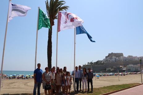 Hoy se ha llevado a cabo el simbólico acto de izada de banderas en las playas Norte y Sur de Peñíscola. Hasta que finalice la temporada de baño, ondearán en la localidad las Banderas Azules, las Banderas de AENOR (ISO), la bandera Qualitur de la Conselleria de Turismo y la Bandera de la Q de Calidad del ICTE, certificaciones a las que hay que sumar el Sendero Azul en Peñismar y el Centro Bandera Azul para el Museo del Mar.