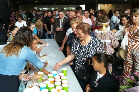 A pesar de la amenaza de lluvia, el acto no ha quedado deslucido, pues se ha trasladado al Palacio de Congresos de la ciudad, donde ha tenido lugar la tradicional misa y la degustación de horchata y "fartons”. Más de 400 dulces se han repartido por parte de la comisión de fiestas y la Corte de Honor, acompañando más de 150 litros de horchata.