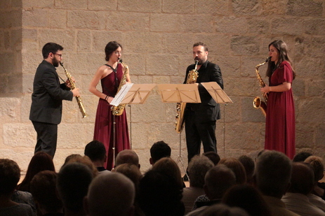 El salón gótico del castillo de Peñíscola se quedó pequeño para acoger a todos los que acudieron el martes por la noche para disfrutar de la música de la formación Rhea Quartet. Un grupo de saxofonistas avalado por los premios y menciones cosechados en diferentes festivales internacionales, y que contaba con el aliciente añadido de disfrutar de las evoluciones de una de sus integrantes, la peñiscolana Iris Guzmán Godia. Una intérprete que comenzó su aprendizaje en la Escuela de Música local, que reside actualmente en Madrid y que junto a sus compañeros -Pablo Fernández Baladrón, Julia Segovia Verdejo y Jaime Augusto Serrano Fernández- forma parte de un colectivo con una enorme proyección.