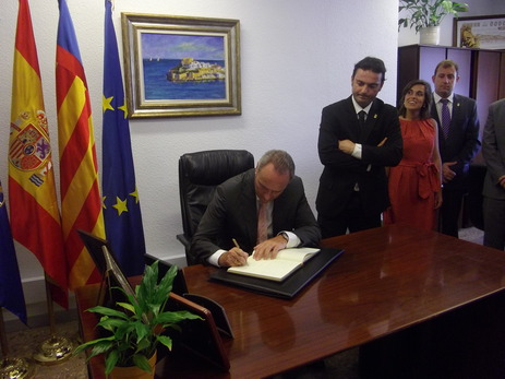 El President de la Generalitat, Alberto Fabra, visitó el Ayuntamiento y firmó en su libro de honor, alentando a alcalde y concejales a trabajar por salir juntos de la crisis.