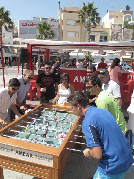 Eran las 11 de la mañana cuando ha comenzado la sexta semana de los Juegos Ambar 2012 con la "ceremonia de apertura", a la que han asistido Andrés Martínez, Alcalde de Peñíscola, representantes del Ayuntamiento y responsables de la firma cervecera dando por inaugurados los Juegos con un saque de honor en un futbolín diseñado para la ocasión por once pintores y trece diseñadores aragoneses. Muñecos futboleros con vestimentas muy llamativas y coloristas han puesto el toque romántico a un acto que ha continuado con una visita por los clásicos juegos ubicados en el “Estadio Ambar”.