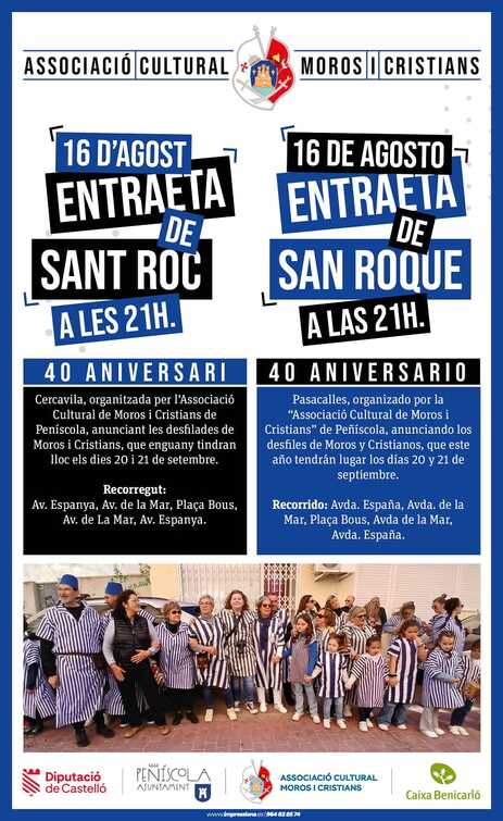 El día 16 de agosto, festividad de San Roque, la “Associació Cultural de Moros i Cristians” de Peñíscola organiza, con la colaboración del excelentísimo Ayuntamiento de la localidad, un aperitivo festivo anunciando las fiestas de Moros y cristianos que este año se van a celebrar los días 19,20 y 21 de septiembre.