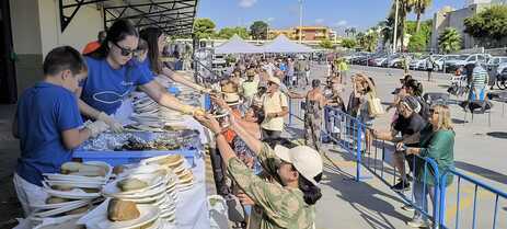 La lonja del puerto ha acogido esta mañana la tradicional sardinada popular, un acto conjunto organizado por el Ayuntamiento de Peñíscola con la colaboración de la Cofradía de Pescadores San Pedro de la localidad. La Reina y la Corte de Honor de las Fiestas han repartido más de 400 kg de sardinas a beneficio de la Asociación de lucha contra el Cáncer en el municipio. En los preparativos y el reparto de las más de 1200 raciones han participado también el alcalde, Andrés Martínez, miembros del cabildo de la Cofradía y de la Corporación Municipal. Al finalizar la degustación gastronómica en el mismo recinto portuario, ha llegado el turno de celebrar los juegos acuáticos. Los más jóvenes han participado en el "palo enjabonado" y en el sorteo de hinchables.