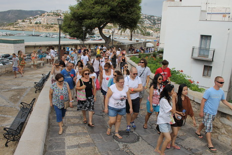 Los 150 participantes en el XXV Festival Internacional de Danses de Vila-real han visitado Peñíscola para conocer de cerca el rico patrimonio de la ciudad. Atraídos por la figura del Papa Luna, bailarines procedentes de Indonesia, Belice, Eslovaquia, Albacete y Vila-real se desplazaron hasta Peñíscola acompañados de los guías que durante estos días les han enseñado diferentes rincones de la provincia. La elección de peñíscola no ha sido casual, puesto que muchos habían manifestado su interés por conocer la ciudad y su castillo. Así, los bailarines recorrieron diferentes rincones de la ciudad en su ascenso hasta el castillo, donde una guía les desveló la interesante Historia del monumento. Cientos de fotos fueron el testimonio que estos visitantes tan peculiares se llevarán a su país de origen. Y es que todos y cada uno de los rincones tanto del castillo como del casco antiguo, que también recorrieron con detalle acompañados de sus guías, fueron inmortalizados por ellos.