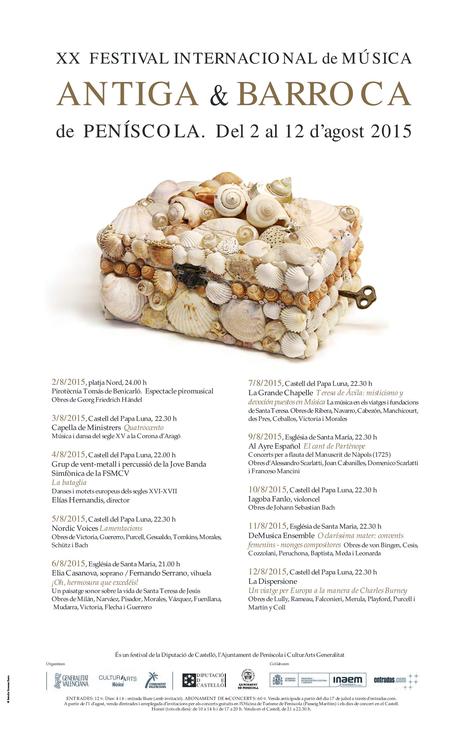 El festival Internacional de Música Antigua y Barroca de Peñíscola, organizado por CulturArts en colaboración con la Diputación de Castellón y el Ayuntamiento de Peñíscola se inaugura el domingo 2 de agosto, a las doce de la noche, en la Playa Norte de Peñíscola, con un espectáculo Piromusical ofrecido por la Pirotécnia Tomás de Benicarló.