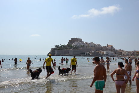 Los dos canes, pertenecientes a la agrupación nacional de rescate Mare Nostrum, colaboran con ejercicios y rutinas preventivos a lo largo de cuatro días a la semana en la playa peñiscolana, sumando así seguridad al dispositivo de salvamento.