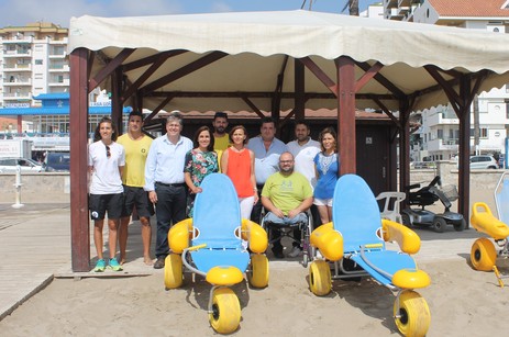 Esta mañana varios representantes del Ayuntamiento de Peñíscola, junto al presidente de Cocemfe Maestrat, Ramón Meseguer, han visitado el Punto Accesible de la Playa Norte para supervisar las medidas de las nuevas instalaciones accesibles que estarán disponibles a partir de la semana que viene. Concretamente se ampliará la zona de sombra con cinco hamacas adaptadas junto a la orilla, que se suma a la renovación llevada a cabo de cuatro sillas anfibias, diez pares de muletas con soportes de arena, soportes acuáticos y sus respectivos sistemas de anclaje y una boya de uso nocturno. Además, en la Playa Sur se instalará un equipamiento infantil adaptado para personas con movilidad reducida.