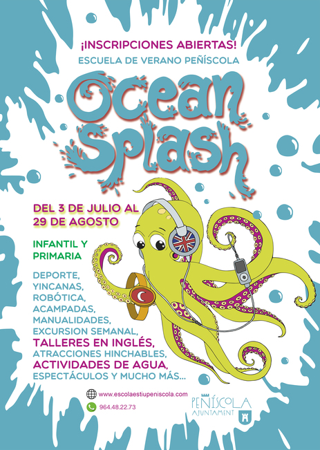 Este año el eje temático esta relacionado con el mundo marino, bajo el nombre OCEAN SPLASH se han programado actividades que potenciaran los conocimientos de las diferentes especies marinas de la zona, las artes de pesca y los deportes de agua. Además de las actividades que se realizaran en el recinto del CEIP Jaime Sanz, se han programado diferentes excursiones relacionadas con la ambientación de esta nueva edición como la visita al Museo del Mar de la ciudad, una excursión a Aquarama ( Benicassim), la jornada de Padel Sur en Peñíscola, Gincana de Agua en las instalaciones Paintball Peñíscola, entre otras.