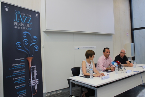 La directora adjunta de Música y Cultura Popular Valenciana, Marga Landete, acompañada del director del artístico del XIV Festival de Jazz de Peñíscola, Jorge García, y el alcalde de Peñíscola, Andrés Martínez, ha presentado hoy el XIV Festival de Jazz de Peñíscola que se celebrará del 20 al 24 de julio en la citada localidad.
